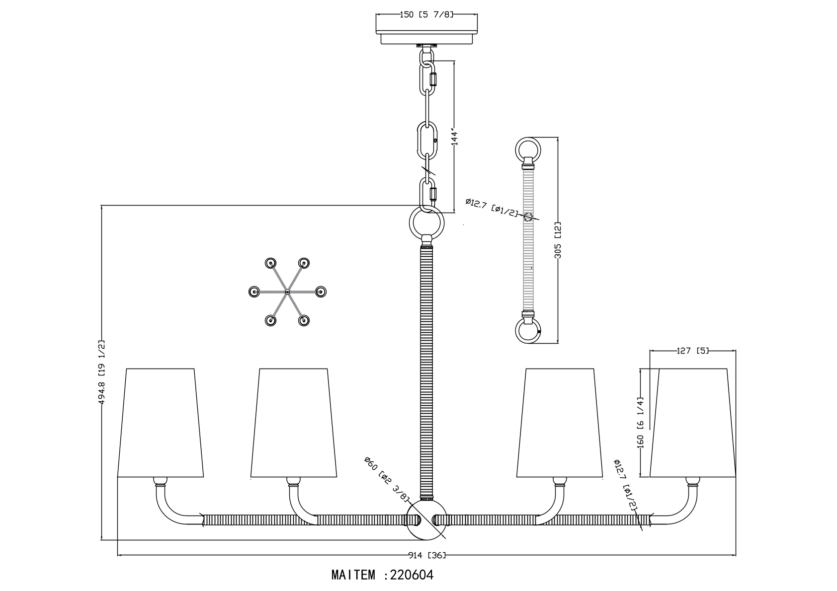 Add a touch of refined elegance to your home with our modern chandelier. This sophisticated fixture features a harmonious blend of black and gold finishes, creating a chic and versatile design. The chandelier's six arms extend gracefully from a central hub, each supporting a crisp, white fabric shade that diffuses light beautifully. The black wrapped detailing on the arms and stem adds a modern twist, while the gold accents provide a luxurious touch. Perfect for dining rooms, living spaces, or entryways, this chandelier effortlessly combines style and functionality. Illuminate your space with this exquisite piece, enhancing your decor with its timeless appeal and contemporary flair.