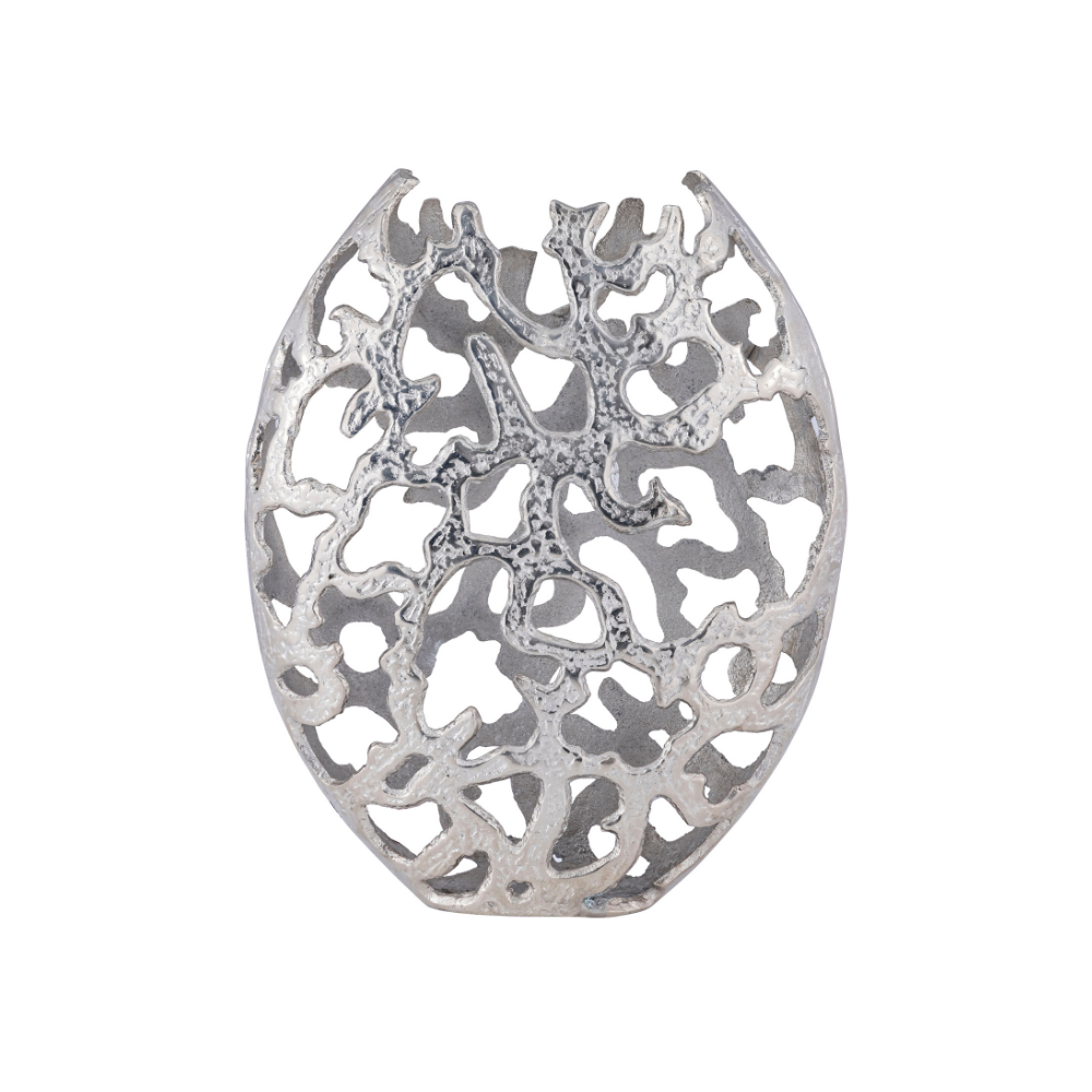 Bring bold artistry into your home with this silver openwork decorative vase, designed to double as both a sculptural accent and a functional vessel. Featuring a striking cutout pattern inspired by organic coral formations, this vase captures the essence of modern elegance with a touch of natural beauty. Crafted from sturdy aluminum with a shimmering silver finish, the vase offers durability while maintaining a light, airy aesthetic. Its unique open structure makes it an eye-catching centerpiece, whether displayed on a console, dining table, or bookshelf. Use it on its own as a piece of modern art, or pair it with dried botanicals, pampas grass, or sculptural stems to create a dynamic focal point.