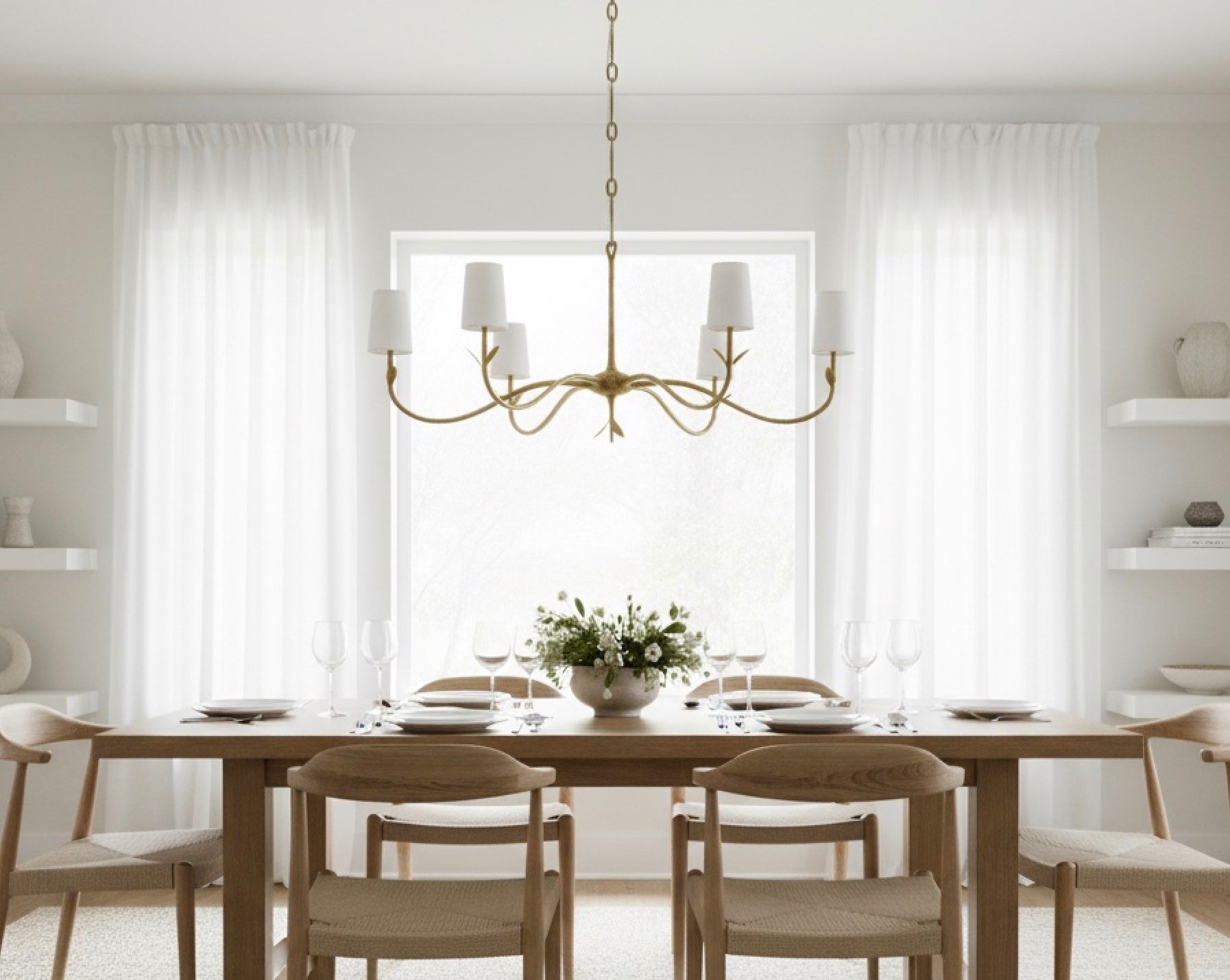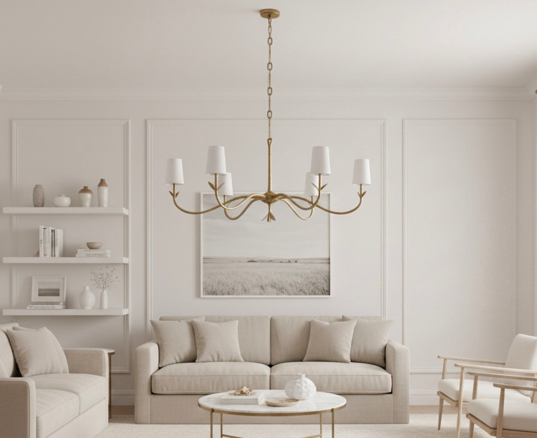 Bring natural elegance into your home with the Sylvie Chandelier. This exquisite fixture features a beautifully sculpted, forged brass frame, designed to mimic the graceful curves of tree branches. Each arm of the chandelier extends outward, accented with delicate leaf-like details, and paired with soft fabric shades that diffuse light, creating a warm and inviting glow. Perfect for enhancing dining rooms, living spaces, or entryways, the Sylvie Chandelier effortlessly blends organic beauty with modern sophistication, adding both charm and functionality to any room.