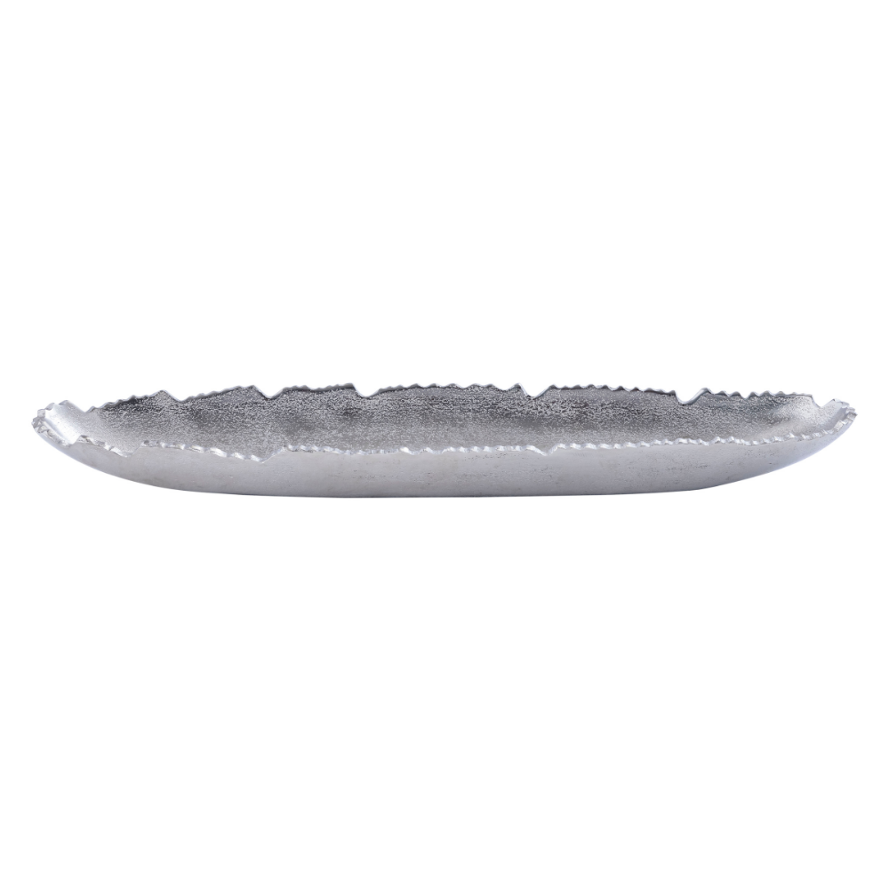 Sleek, modern, and effortlessly chic, this silver elongated decorative bowl is the perfect accent piece for contemporary living. Crafted with a sculptural boat-like silhouette, the design is elevated by a textured, organically inspired edgethat adds dimension and artistry. Made from durable aluminum with a lustrous silver finish, this versatile bowl makes a striking coffee table centerpiece, dining room accent, or entryway display tray. Its elongated form is ideal for showcasing decorative spheres, faux botanicals, or seasonal accents, while its artistic design allows it to shine beautifully on its own.