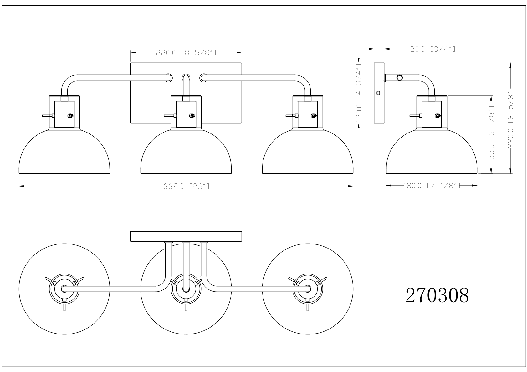 The Lucian three light vanity features a black frame with cloche shaped glass. Sleek lines and exposed hardware give a modern industrial feel.